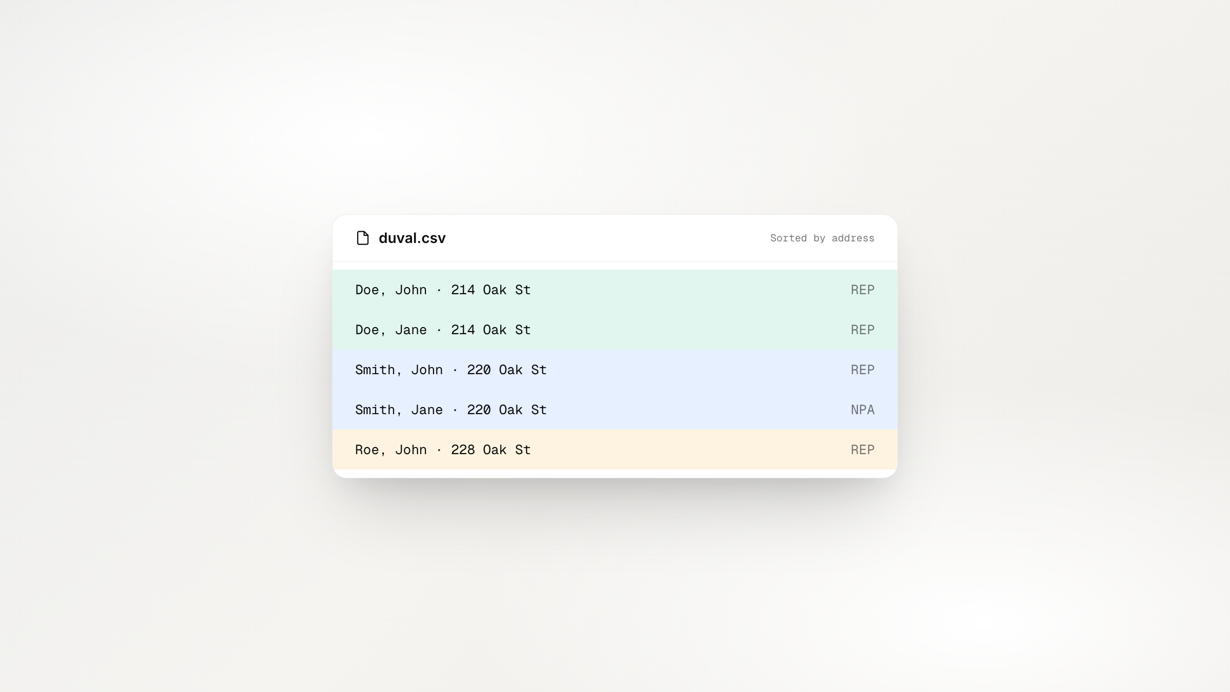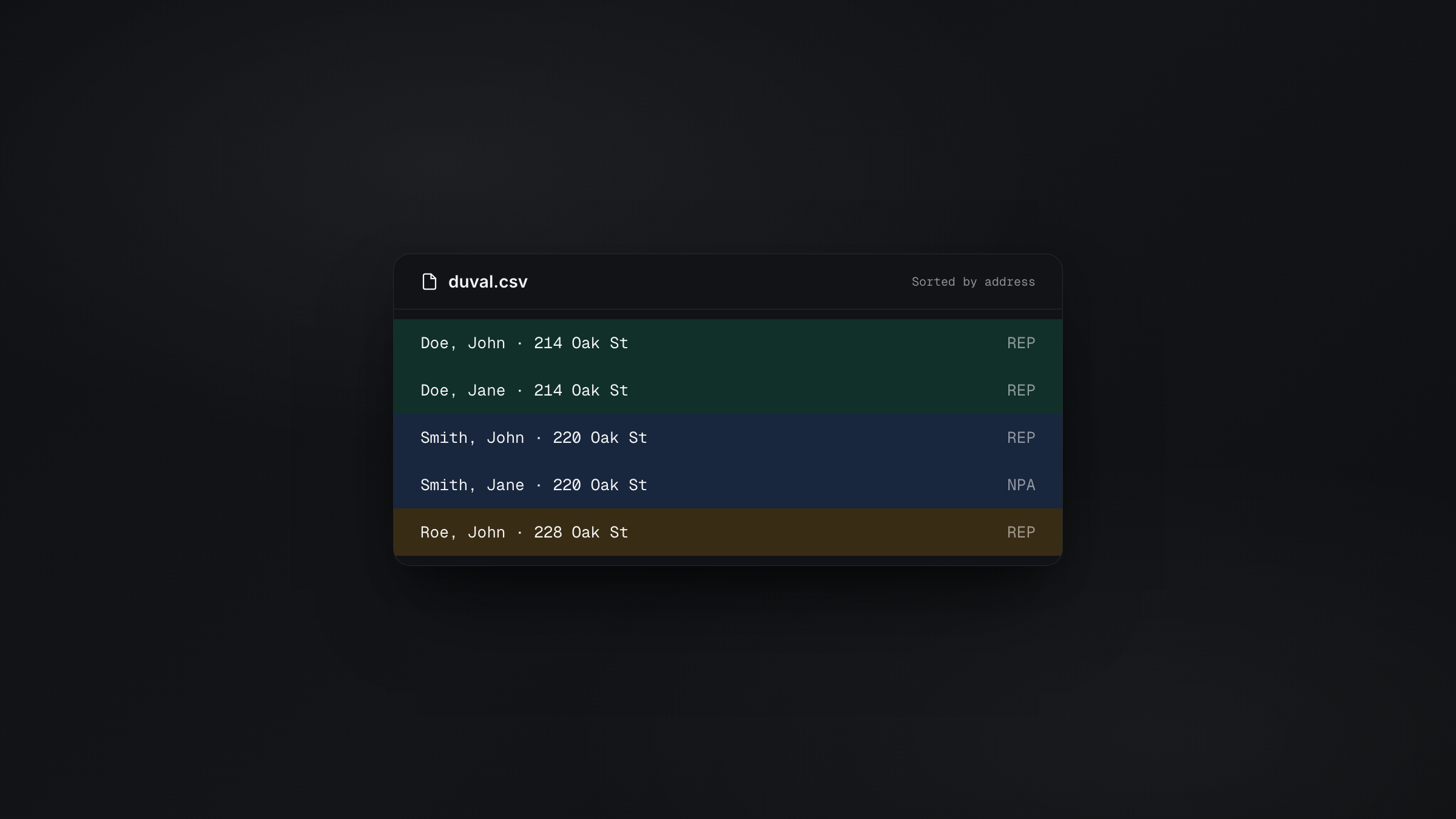 Exports now sort by street address instead of last name. Voters in the same household sit next to each other in your CSV, making review and audit a lot faster. Every new export uses the new order automatically.