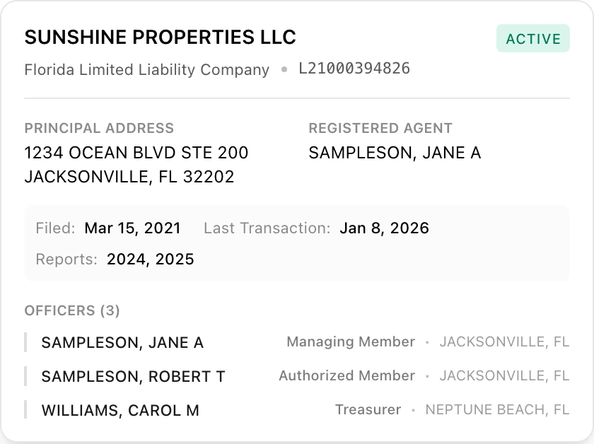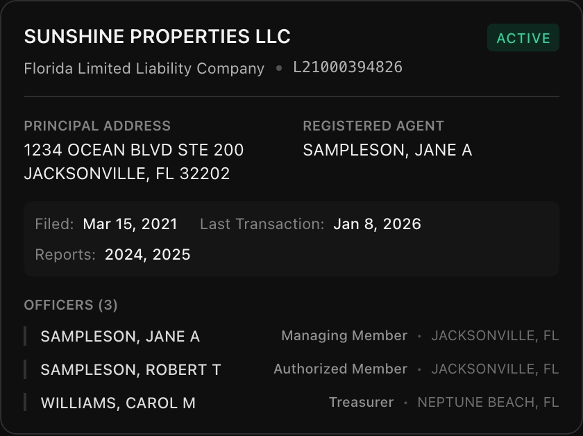 We've integrated Florida's Division of Corporations (Sunbiz) records directly into voter profiles. If a voter is an officer, registered agent, or member of a corporation or LLC, you'll see it on their profile.